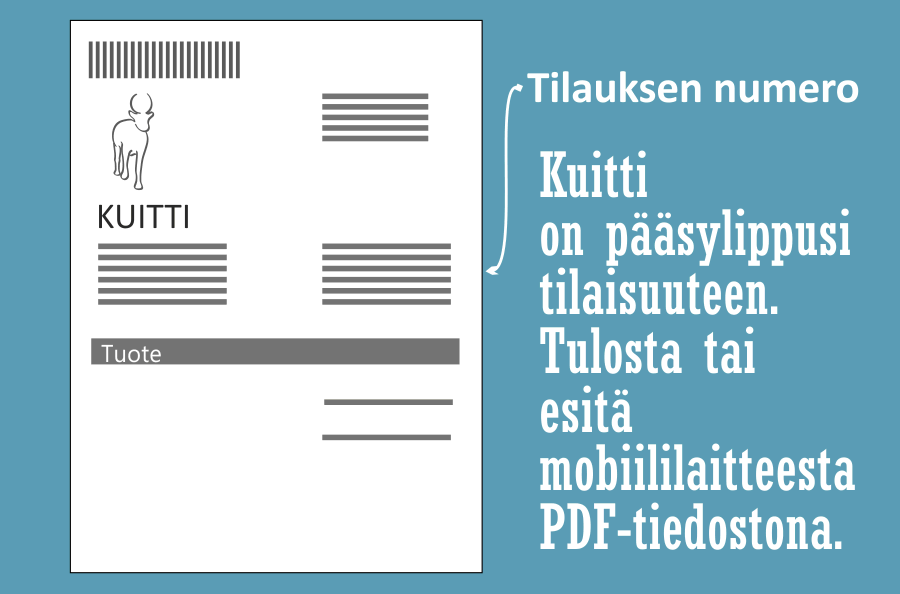 Lataa pdf-lippu puhelimeesi tai tulosta mukaan. Verkkokaupasta saamasi ’Kuitti’ on iltatilaisuuden pääsylippu ja kuittisi maksusta. Tarkastamme liput sisään tullessa. Toimitamme kuitit sähköpostiin erikseen, hieman myöhemmin tilauksen saapumisen jälkeen. Oston jälkeen saapuva tilausvahvistus ei ole tilaisuuden pääsylippu.